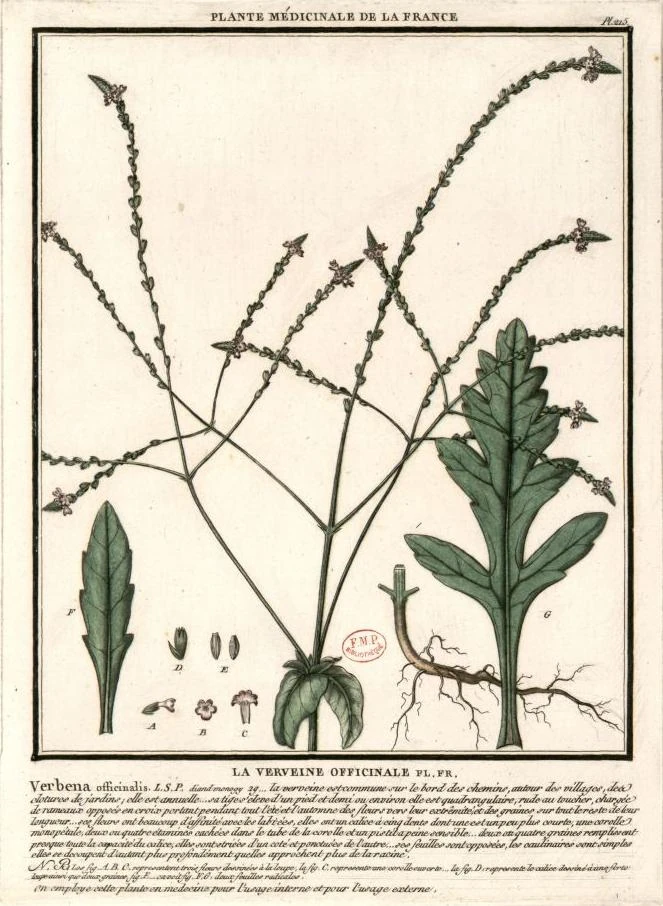PORT : La verveine croît le long des chemins, près des villes & des villages, contre les murailles, &c. : elle fleurit en juin, juillet & août ; elle est toute usage. TIGE : Sa racine est oblongue, peu grosse, fibreuse, d’un goût tirant sur l’amer : elle pousse des tiges hautes d’un pied & demi, quarrés, un peu velues, quelques fois rougeâtres & rameuses. FEUILLES : oblongues, opposées deux à deux, découpées profondément, ridées, d’une couleur verte, plus fonçées en dessus qu’en dessous, d’un goût amer & désagréable. FLEURS : naissent en épis longs et grêles ; elles sont petites, formées en gueules, ordinairement bleues, quelques fois blanchâtres ; le calice qui porte la fleur se change en une capsule qui contient quatre semence jointes ensemble, grêles, oblongues.